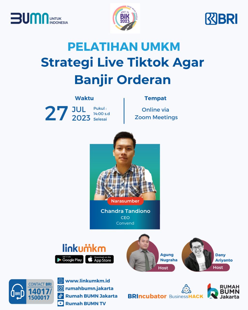 Webinar kali ini akan membahas mengenai topik strategi live tiktok agar banjir orderan Para pemilik usaha UMKM di Indonesia yang ingin meraih kesuksesan dalam bisnis mereka! Kami mengundang Anda untuk bergabung dalam webinar eksklusif kami. Webinar ini akan memberikan wawasan dan strategi live tiktok agar banjir orderan