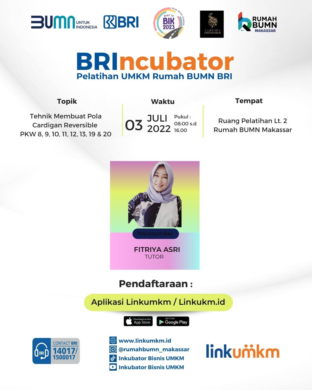 Rumah BUMN Makassar Berkolaborasi dengan Komunitas Jarum Benang Makassar / Lamenda Dress Maker akan melangsungkan kegiatan Pelatihan dengan tema "TEHNIK MEMBUAT POLA CARDIGAN REVERSIBLE PKW 8 9 10 11 12 13 19 DAN 20" Diharapkan output pelatihan ini akan meningkatkan skill/keterampilan agar dapat membantu meningkatkan kesejahteraan rumah tangga.