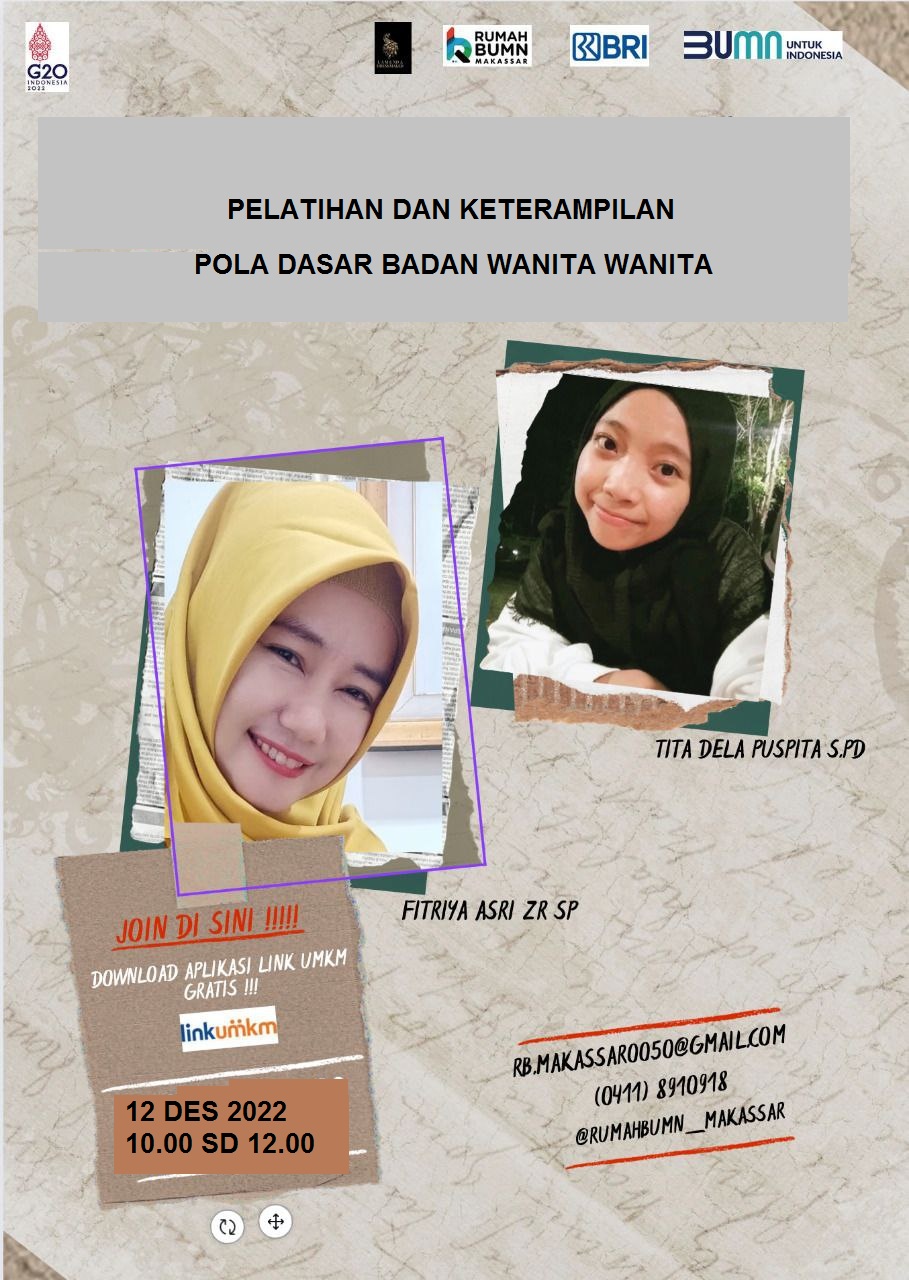 Rumah BUMN Makassar Berkolaborasi dengan Komunitas Dress Maker dan mikromentor chapter makassar akan melangsungkan kegiatan Pelatihan dengan tema "membuat Pola Dasar badan Wanita kelas teknis pkw 16" Diharapkan output pelatihan ini akan meningkatkan skill/keterampilan agar dapat membantu meningkatkan kesejahteraan rumah tangga.