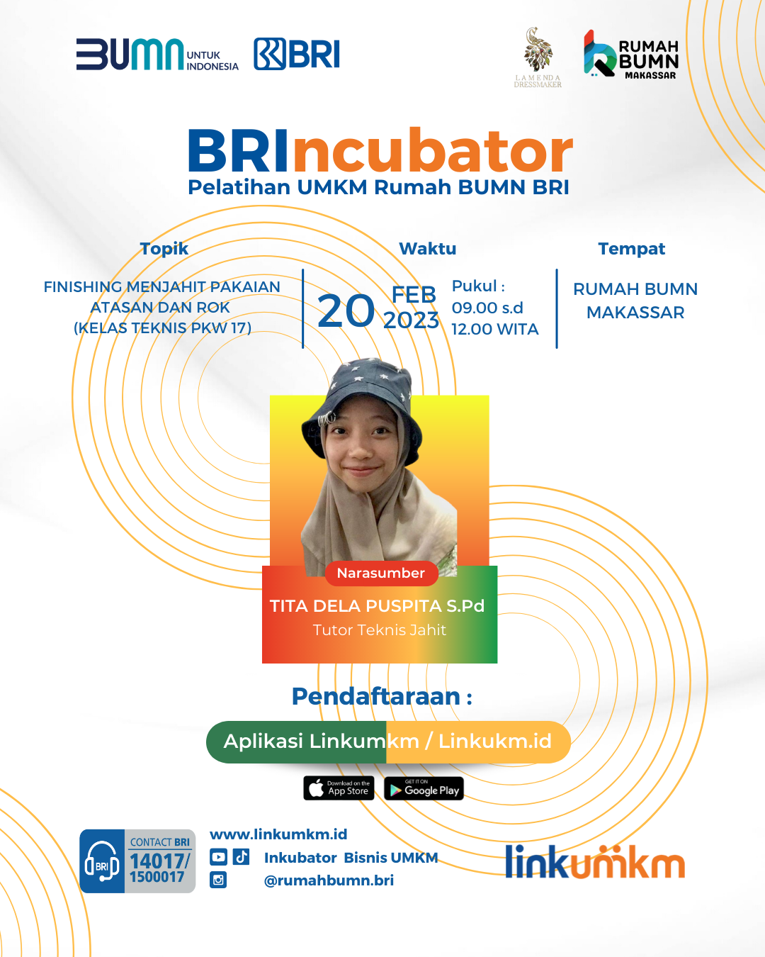Rumah BUMN Makassar Berkolaborasi dengan Komunitas Dress Maker dan mikromentor chapter makassar akan melangsungkan kegiatan Pelatihan dengan tema "FINISHING MENJAHIT PAKAIAN ATASAN DAN ROK KELAS TEKNIS PKW 17" Diharapkan output pelatihan ini akan meningkatkan skill/keterampilan agar dapat membantu meningkatkan kesejahteraan rumah tangga.