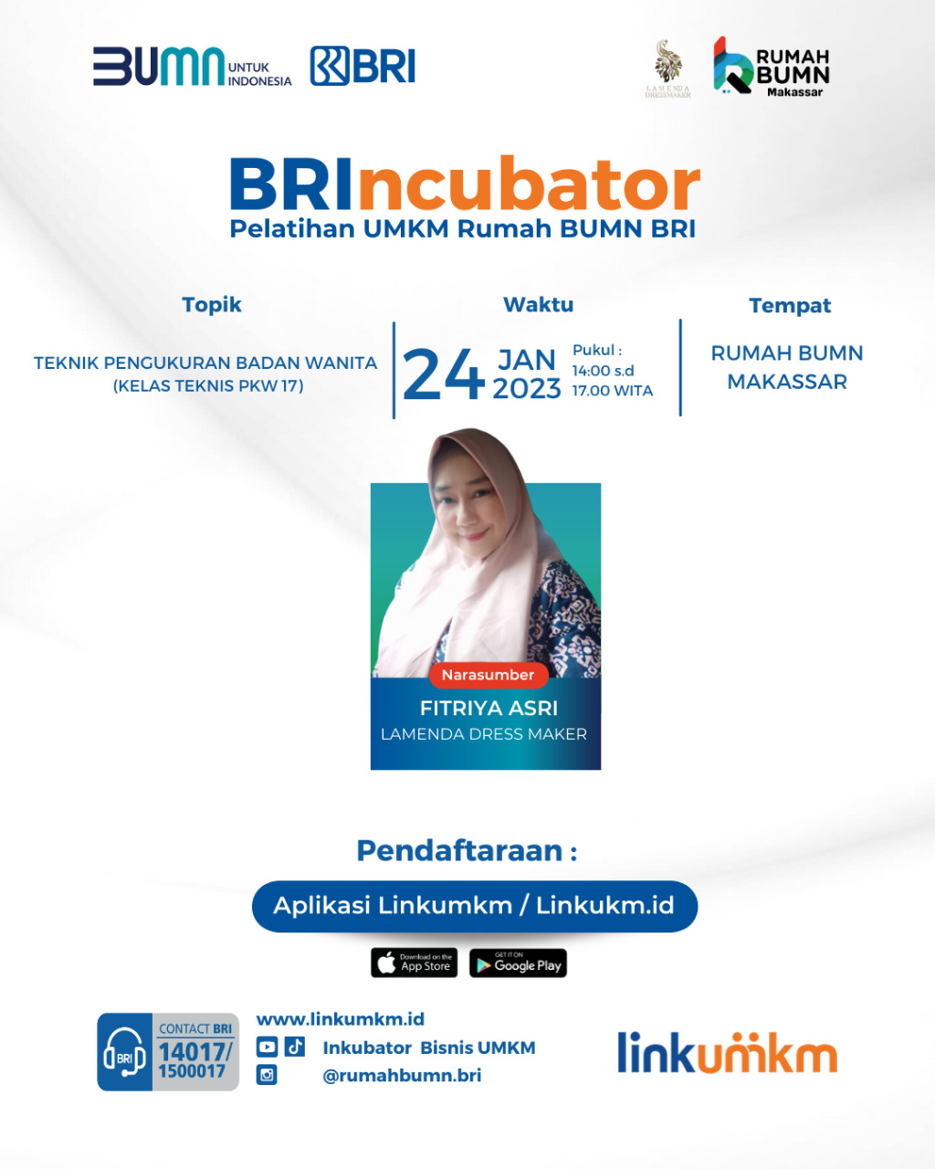 Rumah BUMN Makassar Berkolaborasi dengan Komunitas Dress Maker chapter makassar akan melangsungkan kegiatan Pelatihan dengan tema "TEKNIK PENGUKURAN BADAN WANITA PKW 17" Diharapkan output pelatihan ini akan meningkatkan skill/keterampilan agar dapat membantu meningkatkan kesejahteraan rumah tangga.