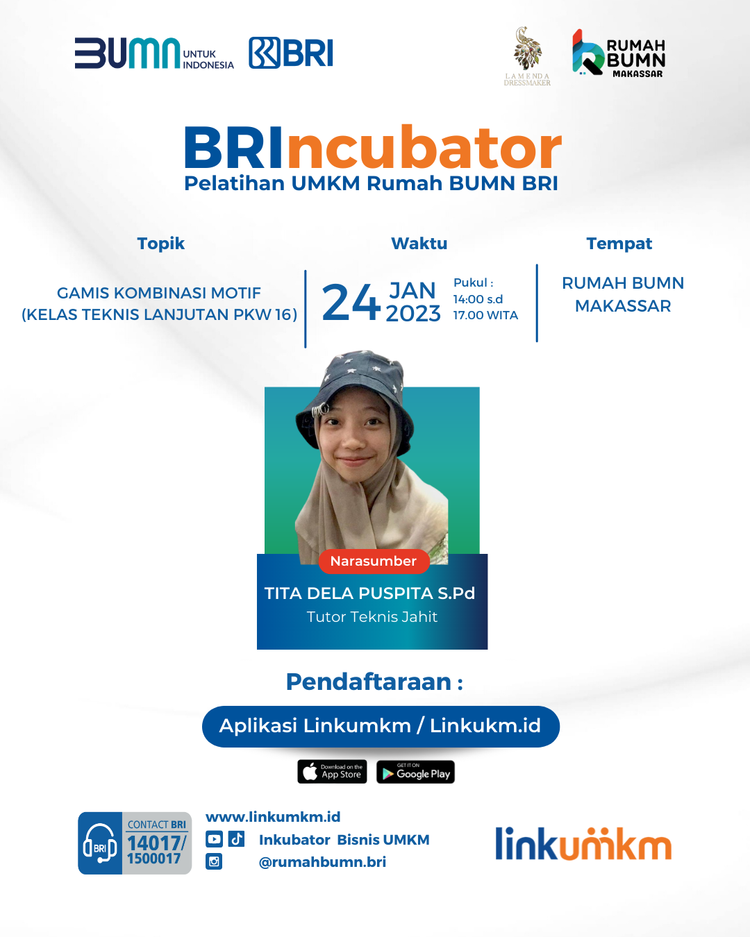 Rumah BUMN Makassar Berkolaborasi dengan Komunitas Dress Maker dan mikromentor chapter makassar akan melangsungkan kegiatan Pelatihan dengan tema "GAMIS KOMBINASI MOTIF KELAS LANJUTAN PKW 16" Diharapkan output pelatihan ini akan meningkatkan skill/keterampilan agar dapat membantu meningkatkan kesejahteraan rumah tangga.
