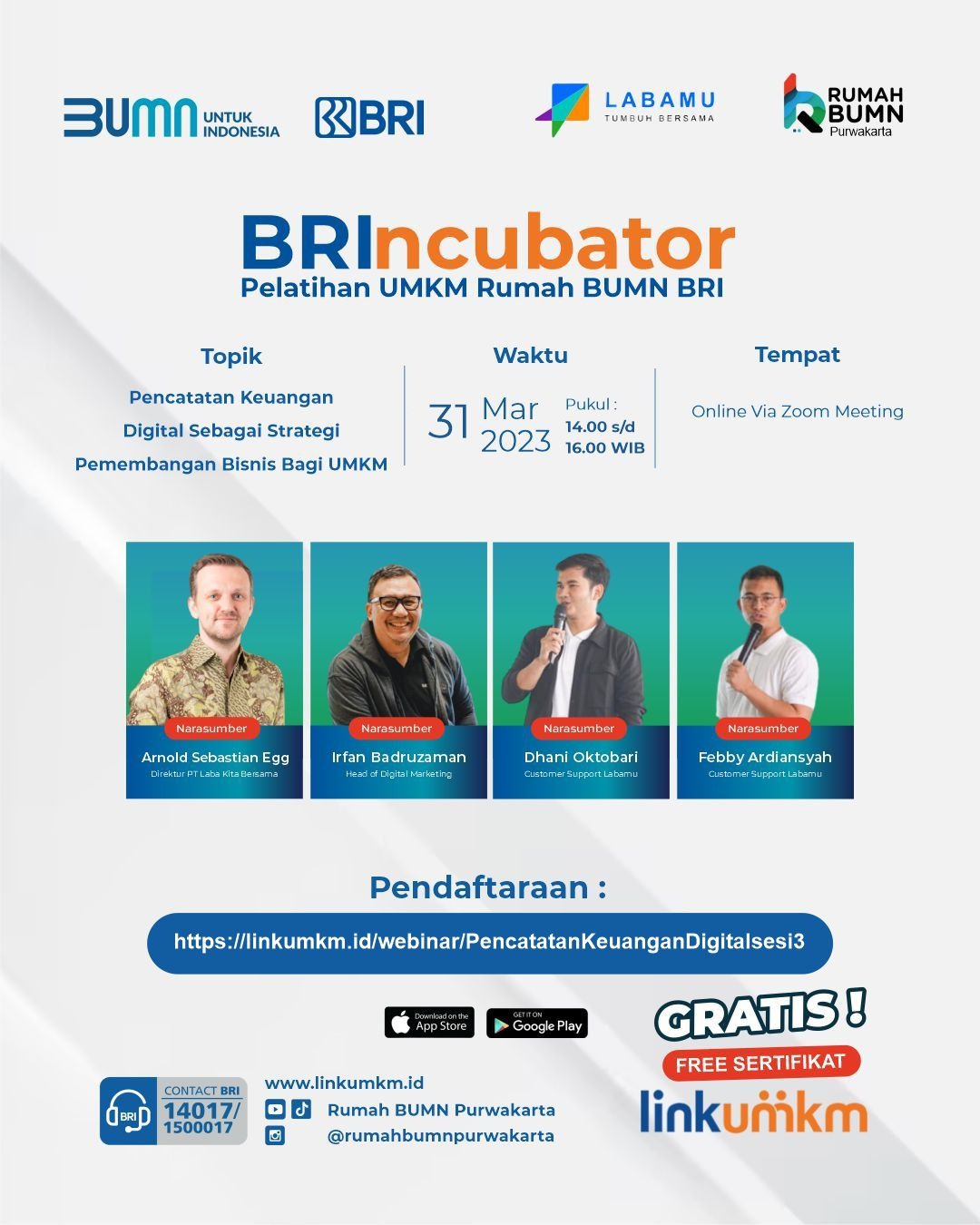 Yuk ikut pelatihan yang akan dilaksanakan oleh Rumah BUMN Purwakarta bersama Labamu. Selama kegiatan akan dibahas secara tuntas bagaimana cara membuat pencatatan keuangan digital